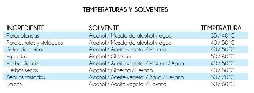 - Temperatura del baño maría: Configuraremos la temperatura del baño maría según el solvente y el ingrediente utilizado. Generalmente se usarán temperaturas bajas que rondan entre los 40 y 60 °C para respetar el aroma natural de los ingredientes.
