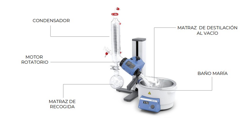 - Baño maría: calienta el matraz a una temperatura controlada para iniciar la evaporación.