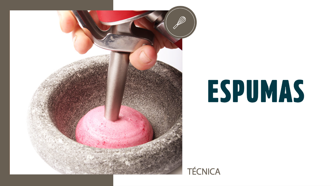Las espumas son creaciones aireadas que se hacen con un sifón de cocina cargado con gas (generalmente óxido nitroso, N2O) para incorporar aire en una mezcla líquida o fluida. Esta técnica permite crear texturas muy ligeras y cremosas, perfectas para platos dulces y salados, añadiendo una textura única y un toque visual impresionante.