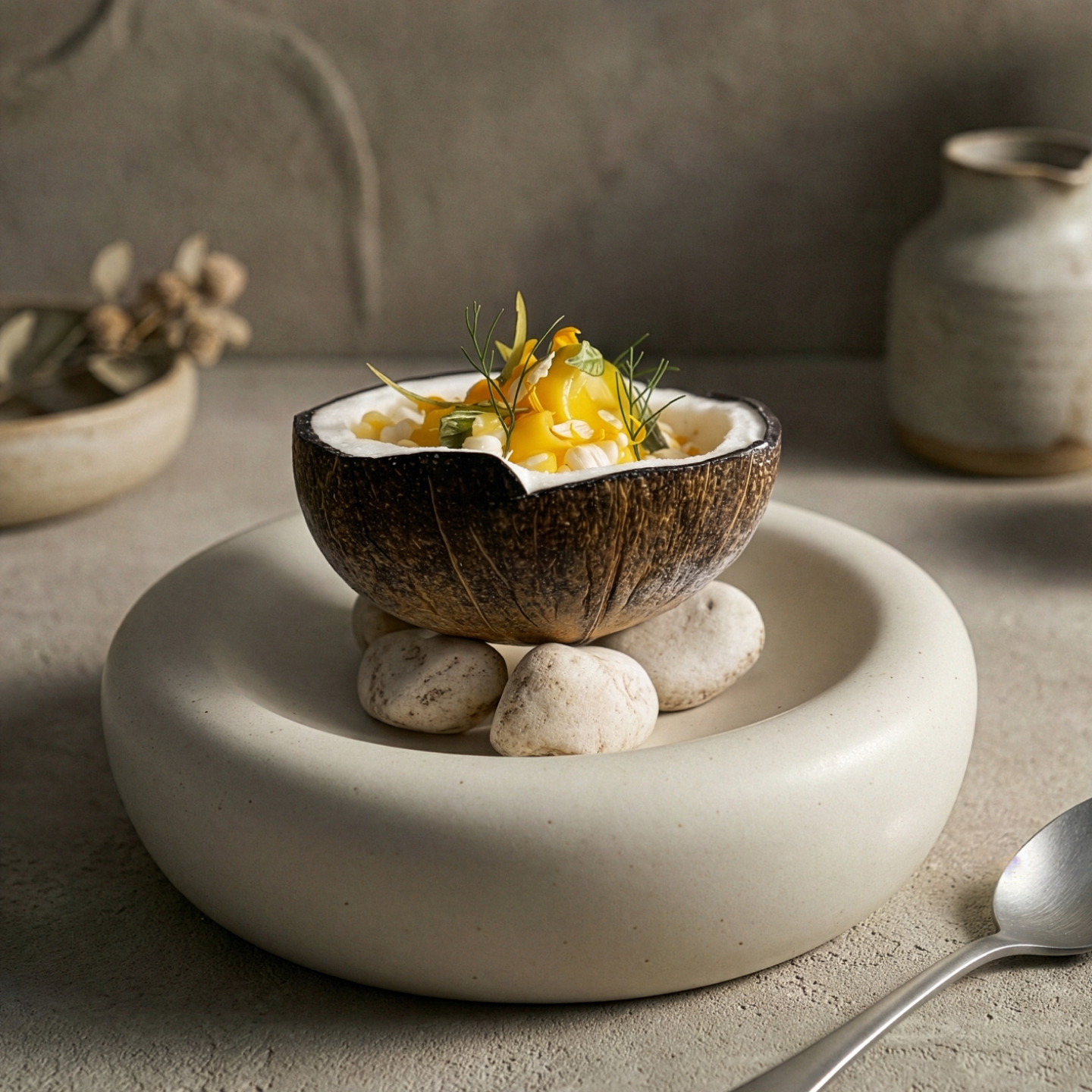 Un postre que sabe a playa, pero pensado con cabeza de servicio. Toma la idea nostálgica del helado servido en su propia fruta y la lleva a un lenguaje más afinado, fresco y útil para restaurante. Coco, lima, mango y maracuyá en un montaje ligero, tropical y nada obvio.